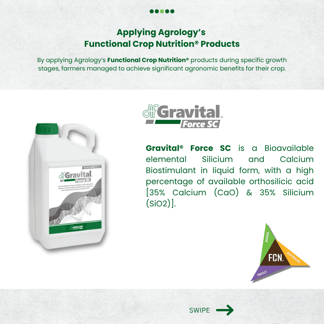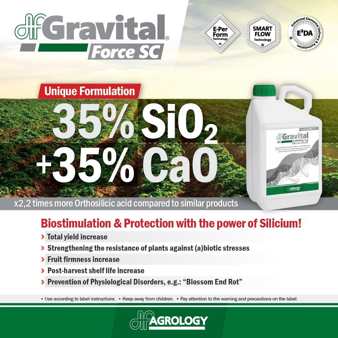 Gravital® Force SC is a Silicium (SiO2, 35%) elemental Biostimulant, rich in Calcium (CaO, 35%), embedded with the Hybrid Formulation & Performance Technology E-PerForm®, which utilizes the synergistic action of Elemental Biostimulant (Si) and nutrition element (Ca) and ensures high availability of Orthosilicic acid.